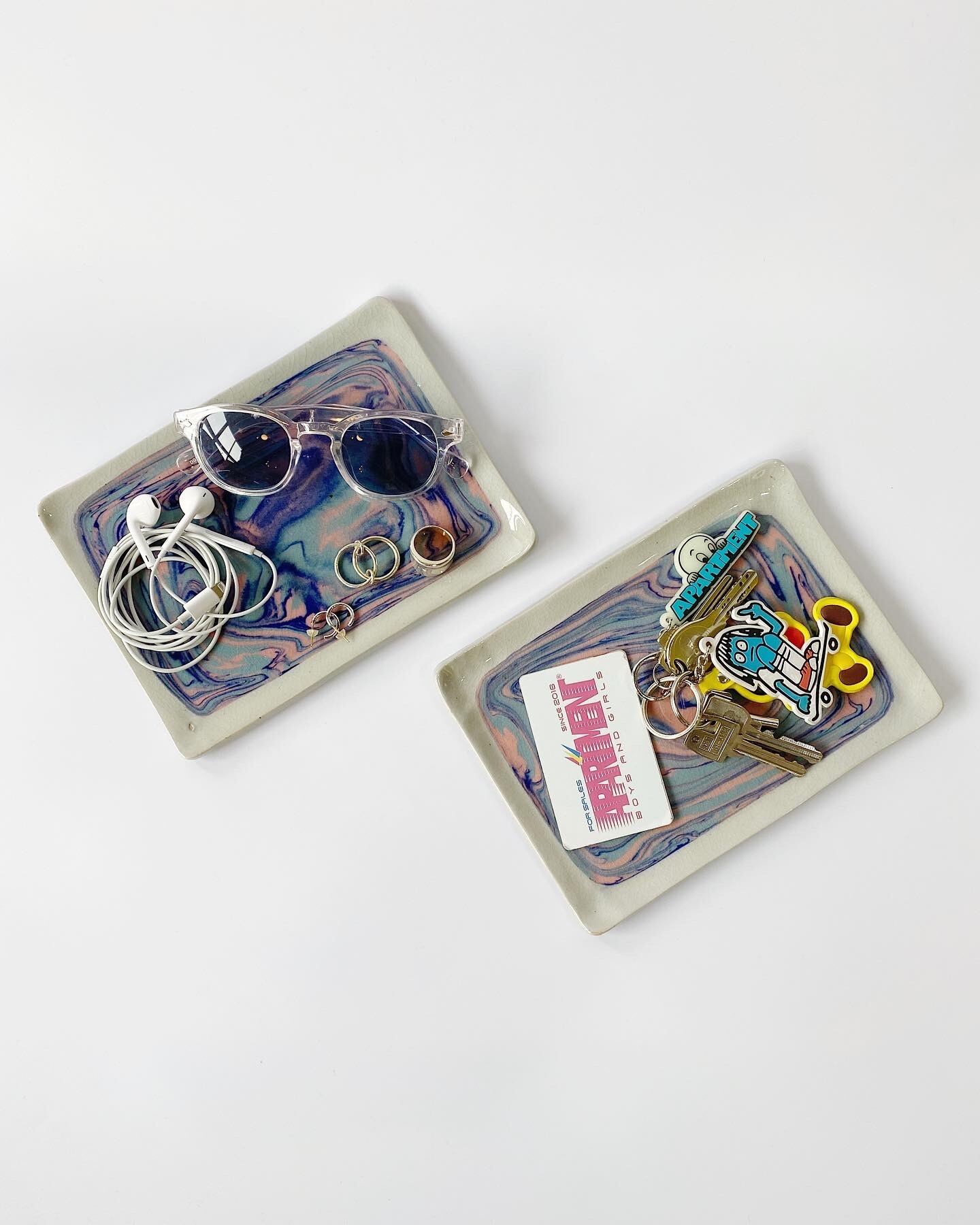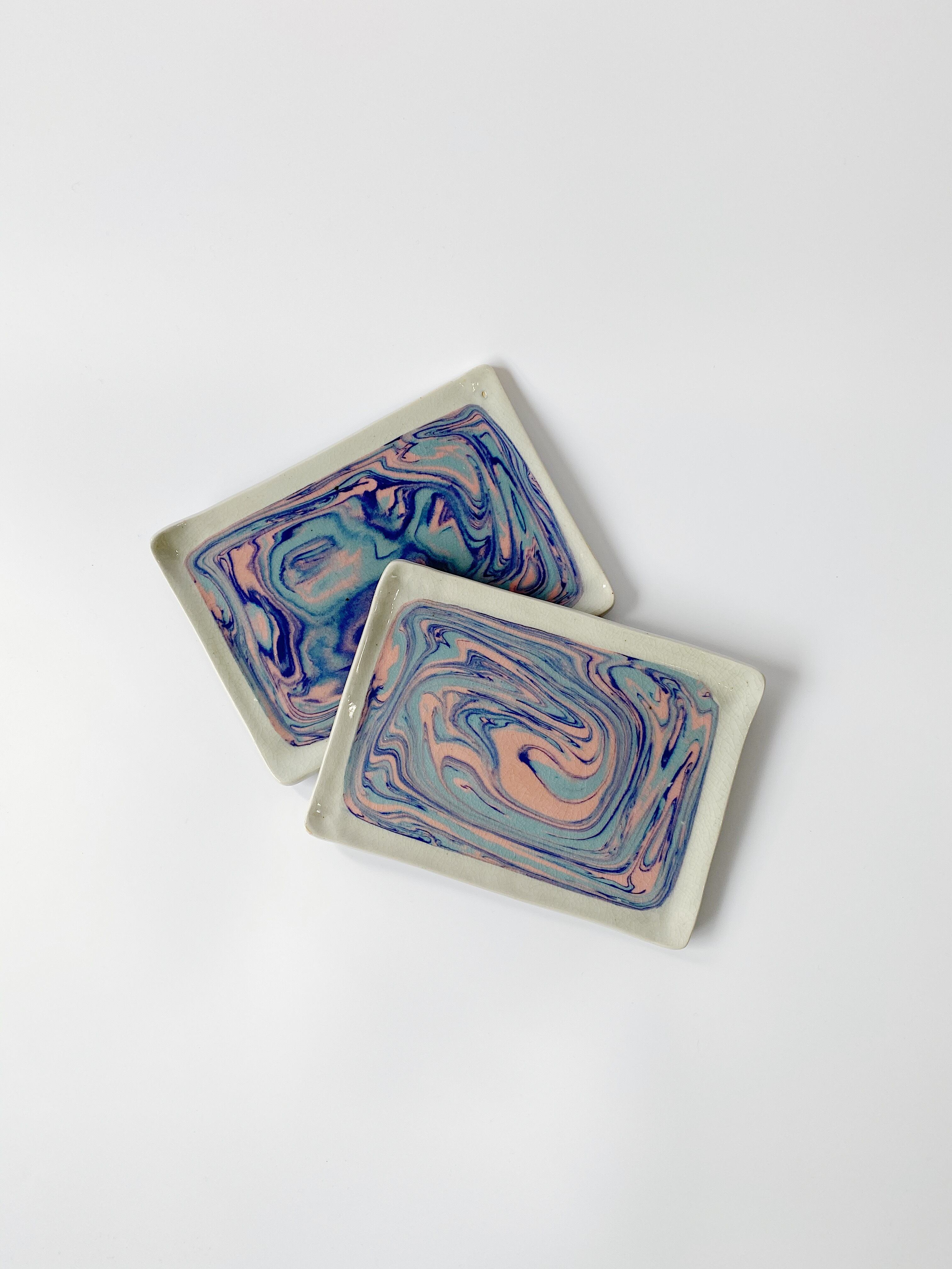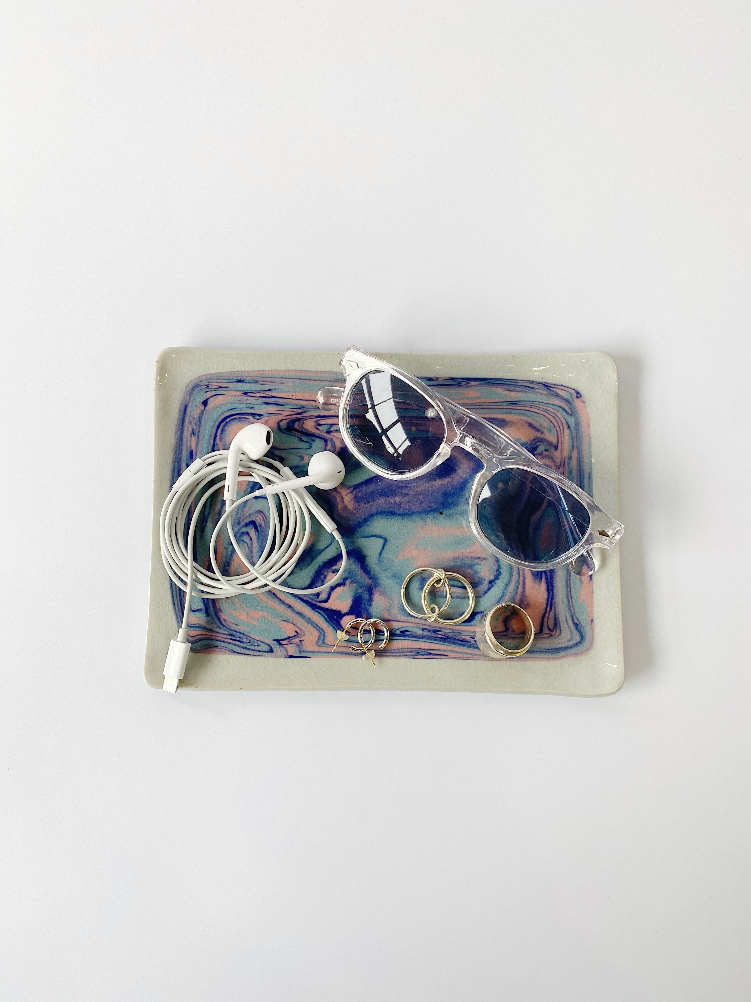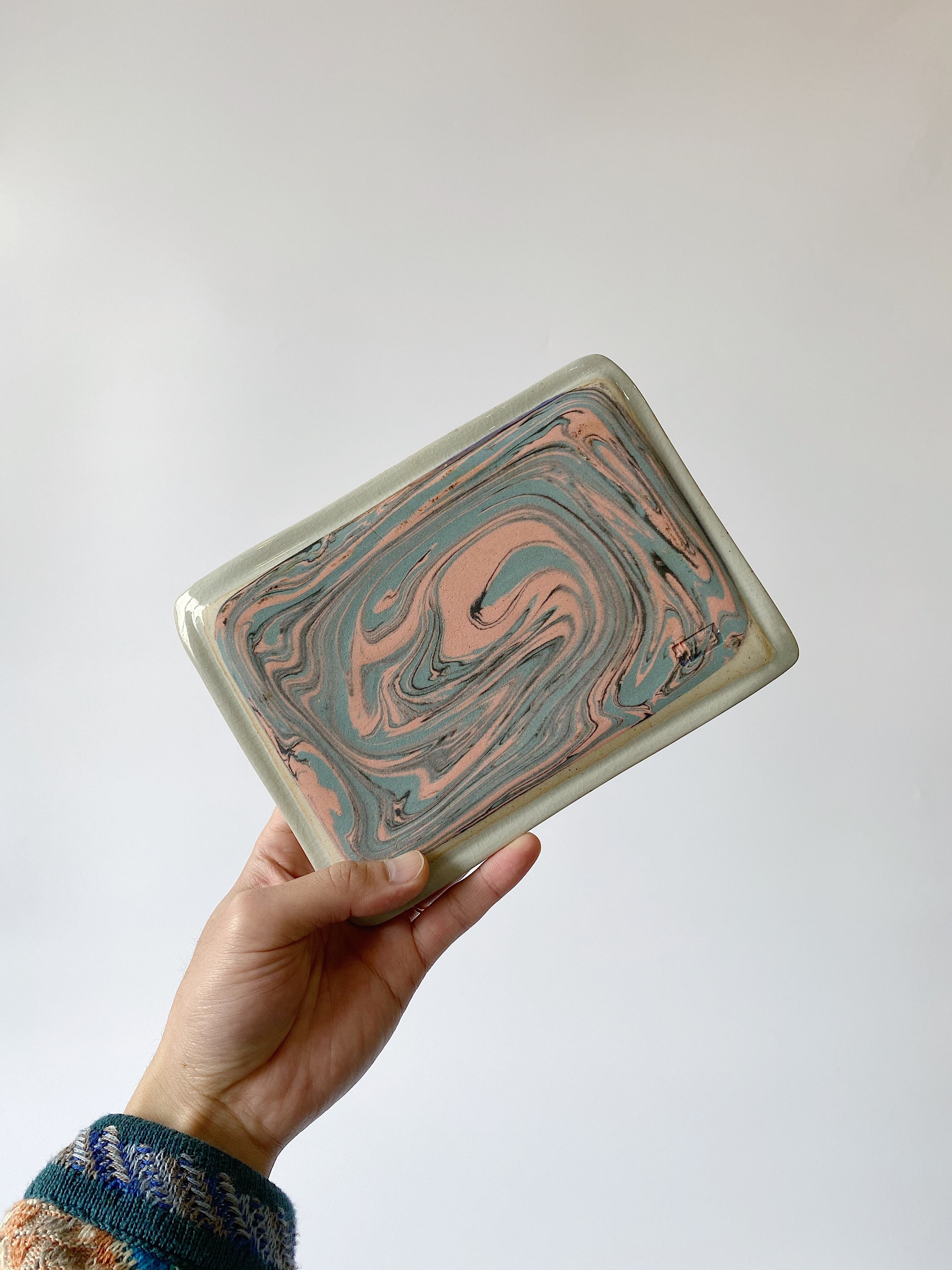 ハンドメイドで作られたであろう絶妙なマーブル模様のお皿。おかずをのせて食卓に。玄関の鍵置きに。お好きに使ってください。(サイズ感は縦15cm×横20cmほど)