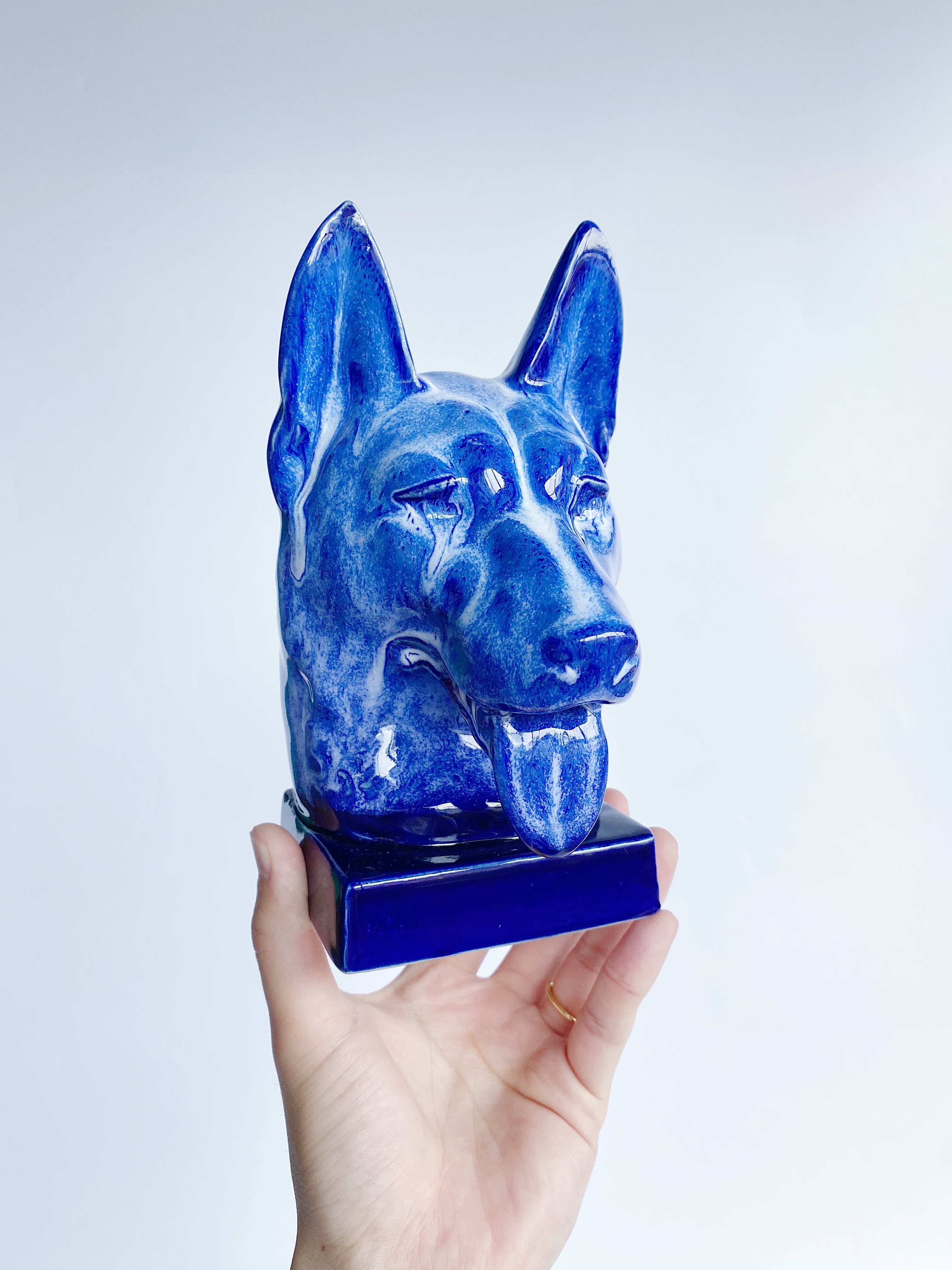 犬種はおそらくシェパード、陶器製、マーブル模様のブルーも素敵です。